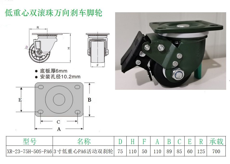 低重心双滚珠万向刹车脚轮